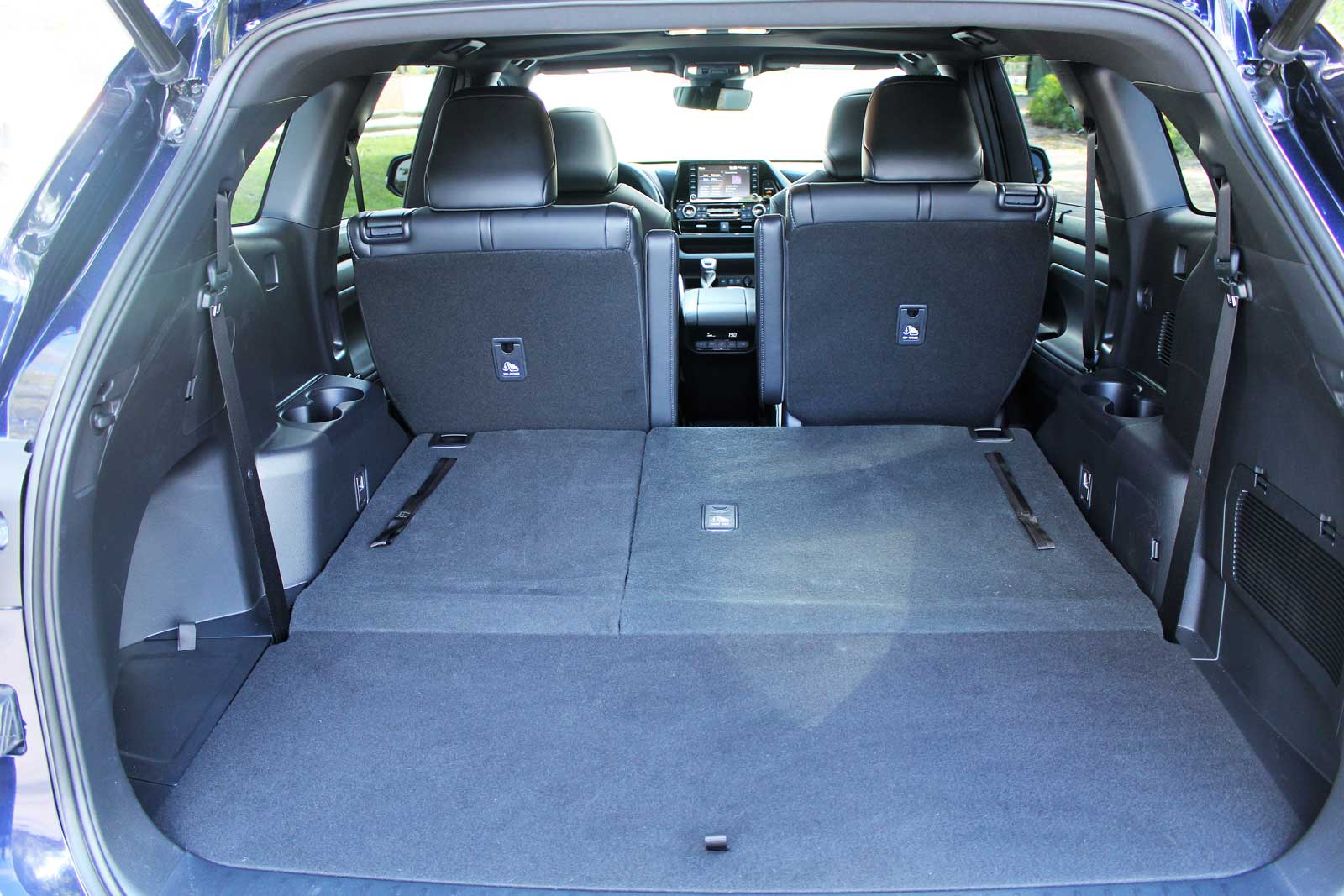 L’espace de chargement totalise 1 351 litres derrière la deuxième rangée et 453 litres derrière la troisième, des gains par rapport à l’ancien Highlander, et un volume quasi identique de 2 387 litres derrière la première rangée. Le cache-bagages peut être rangé sous le plancher, un atout fort pratique. Toutefois, seuls les CX-9 et Acadia sont moins logeables.