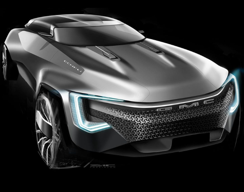• Le dessin montre un véhicule électrique futuriste portant les logos GMC et Denali