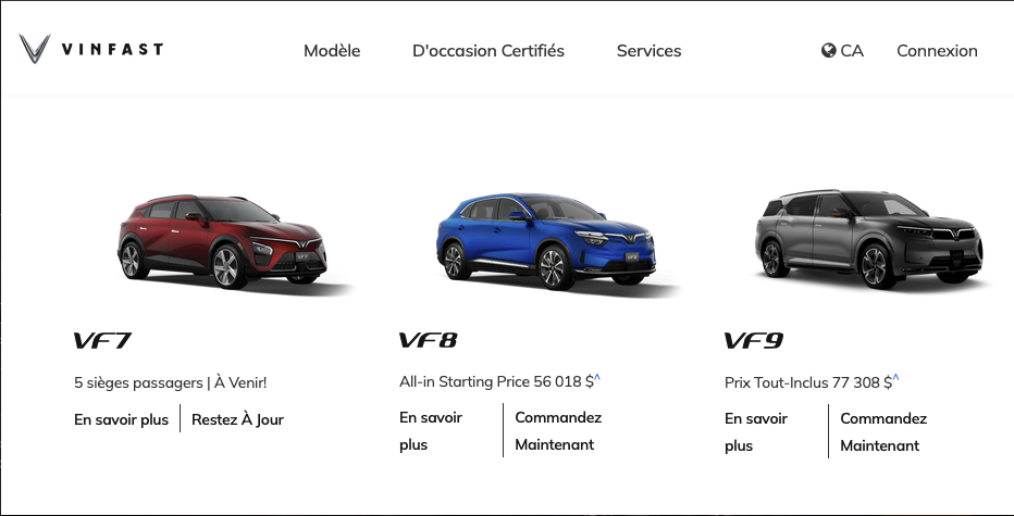 VinFast a retiré le VF6 de ses pages consacrées aux futurs modèles au Canada et aux États-Unis. Sur ses deux sites nationaux, le constructeur affiche maintenant les VF8 et VF9 déjà en vente, tandis que le VF7 demeure indiqué comme « à venir ».