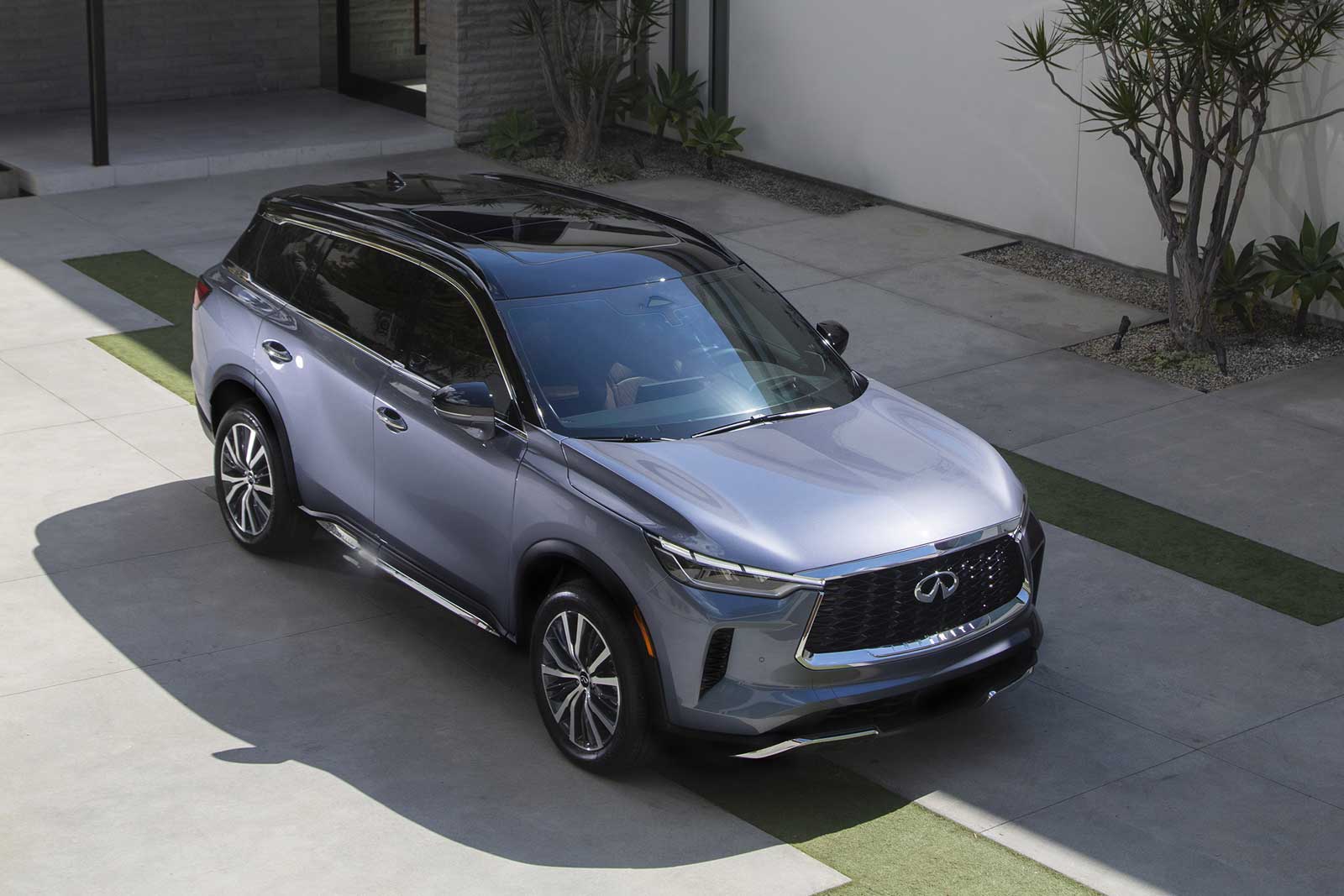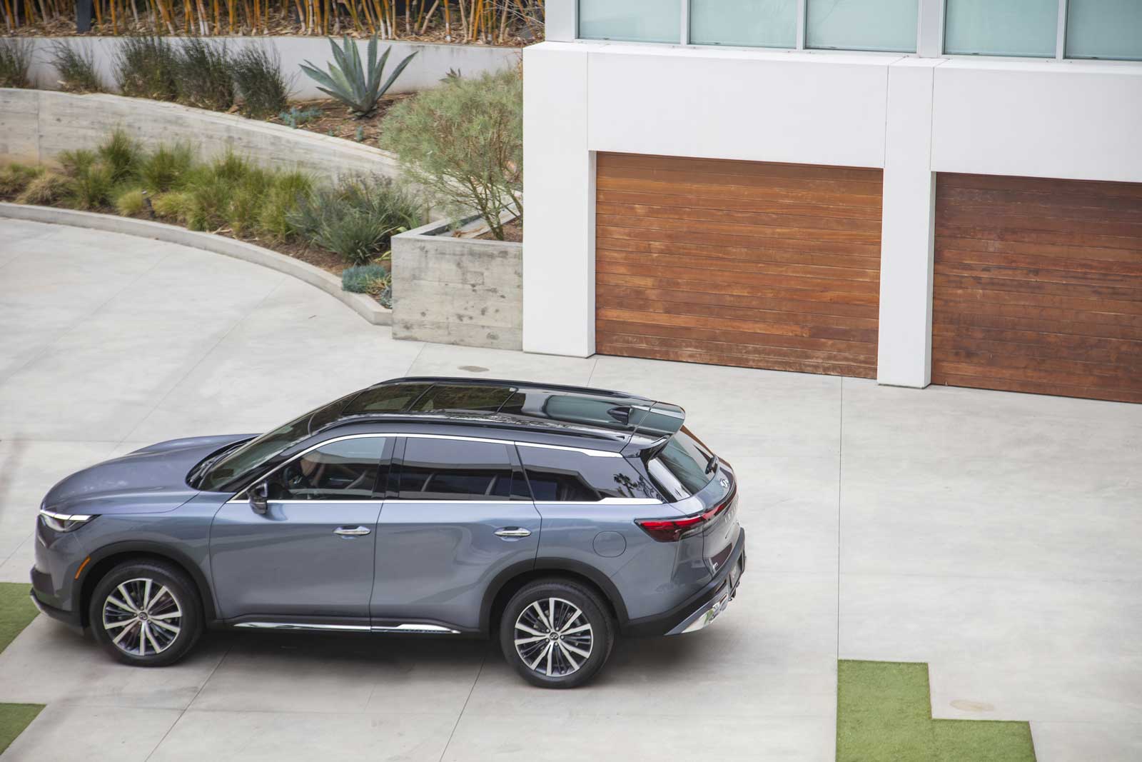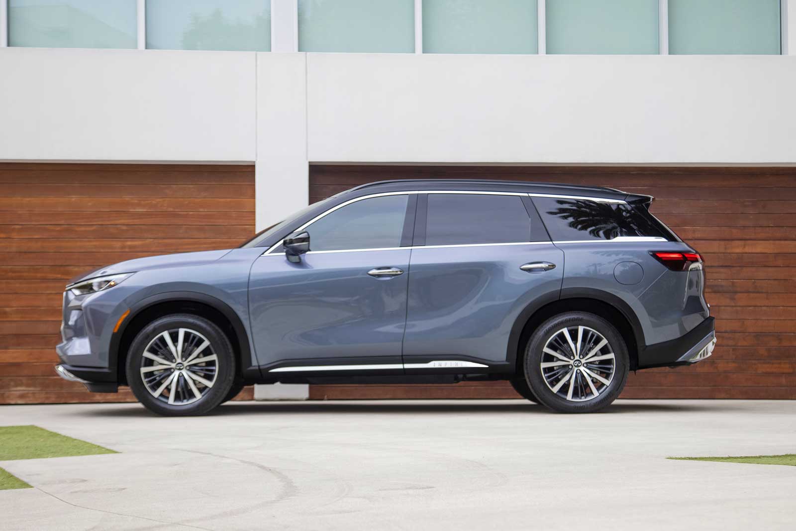 Ça commence avec une carrosserie plus élégante et mieux proportionnée, rehaussée de la calandre traditionnelle d’Infiniti, doté d’un contour chromé dans lequel est inscrit le nom de la marque en lettres majuscules, en plus du logo. Une nouvelle peinture signature nommée Moonbow Blue est introduite, décrite comme étant « le silence dans la lumière de la pleine lune lors d’une humide soirée d’été ». Ses pigments affichent une teinte passant du mauve au vert selon la lumière et les ombrages, ce que nous avons hâte d’observer en personne. Un toit peint en noir est désormais disponible en option, conférant au multisegment une apparence contemporaine, et la plupart des déclinaisons sont chaussées de roues en alliage de 20 pouces.