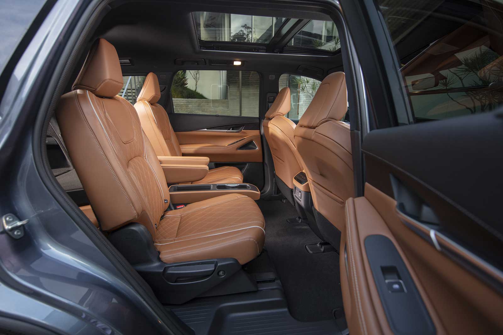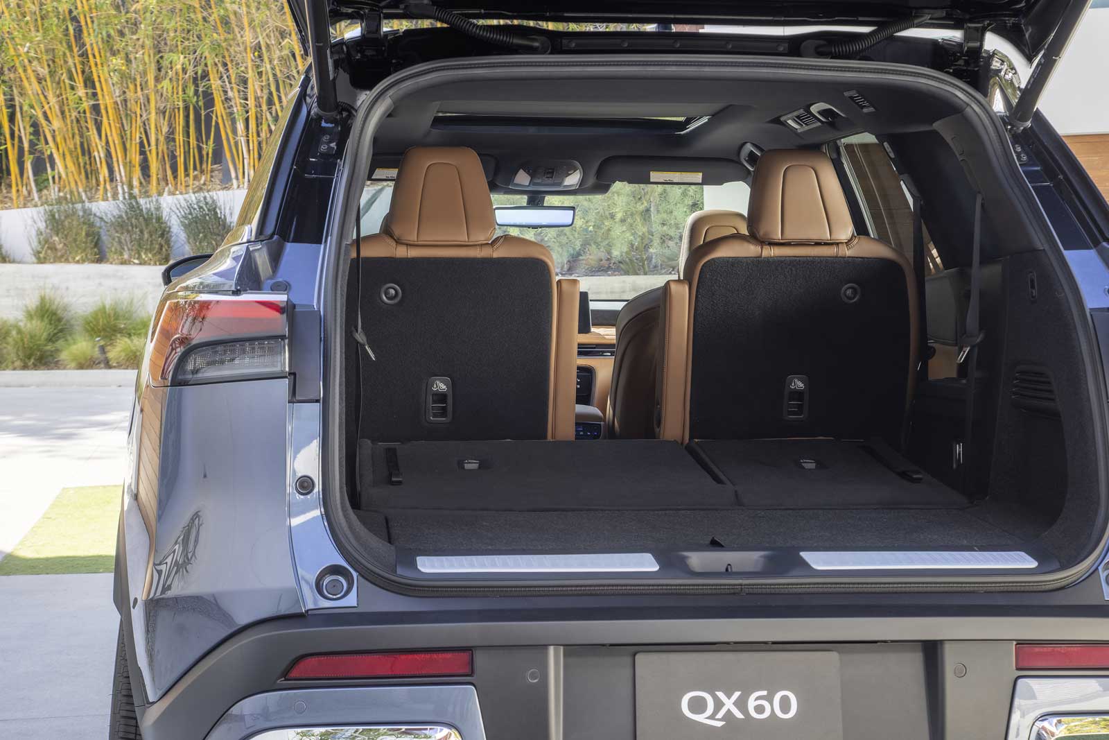 Comme avant, le QX60 comprend trois rangées de sièges pour une capacité de sept personnes, alors que la nouvelle version AUTOGRAPH propose des sièges capitaine dans la deuxième rangée pour accommoder six personnes, une première pour le modèle. Selon la marque, le QX60 dispose d’un aménagement de type salle de théâtre, les sièges arrière étant positionnés plus haut que ceux d’en avant, sans compter un gain au chapitre de l’espace pour les jambes, ou ce qu’il caractérise « de la hanche à la cheville ». La première rangée est munie de sièges chauffants, alors que des fauteuils ventilés et à fonction de massage sont livrables, tout comme des sièges chauffants à la deuxième rangée. On retrouve maintenant quatre ensembles d’ancrage LATCH pour les sièges de bébé, soit deux dans la deuxième rangée et deux dans la troisième. L’espace de chargement est légèrement plus généreux qu’auparavant.