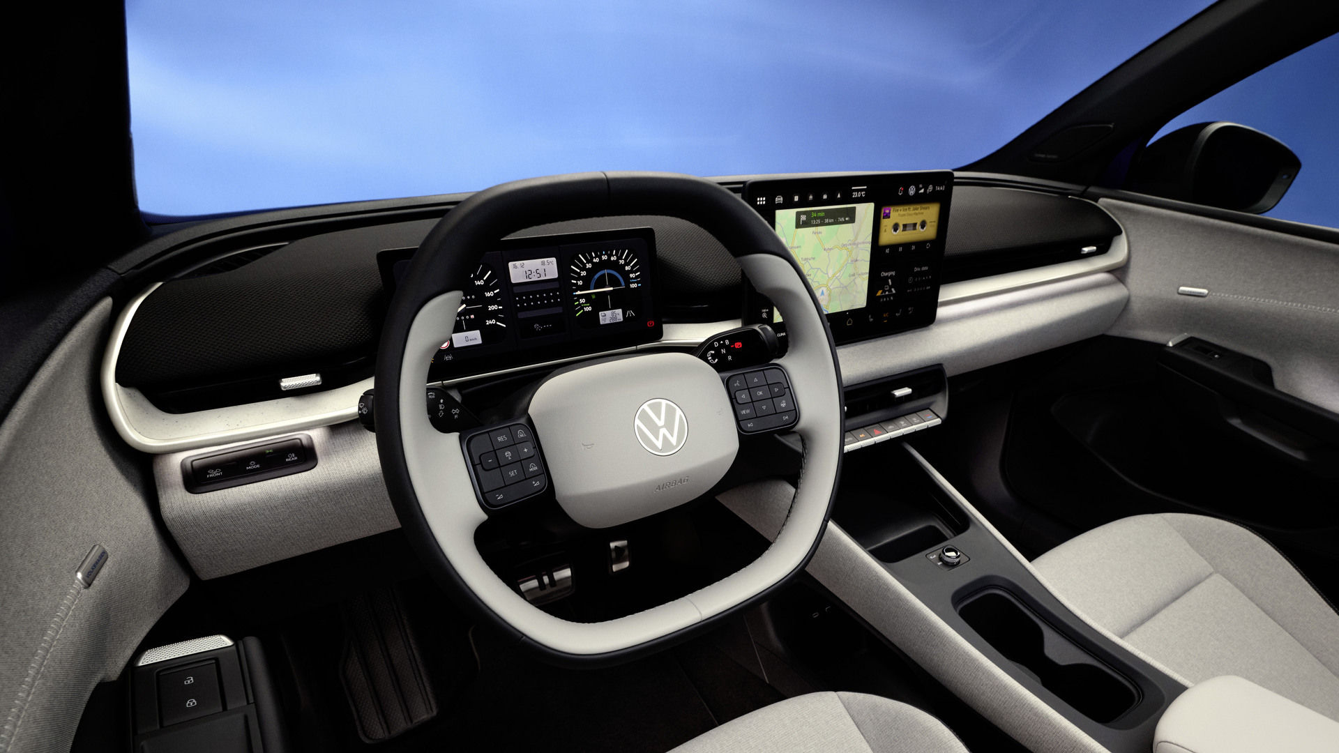Les matériaux utilisés dans l’ensemble de l’habitacle comprennent des tissus à toucher doux sur le tableau de bord et les portes, conformément à l’orientation de design « Pure Positive » de Volkswagen. Le constructeur affirme que cette approche met l’accent sur la chaleur, la clarté et une utilisation intuitive.