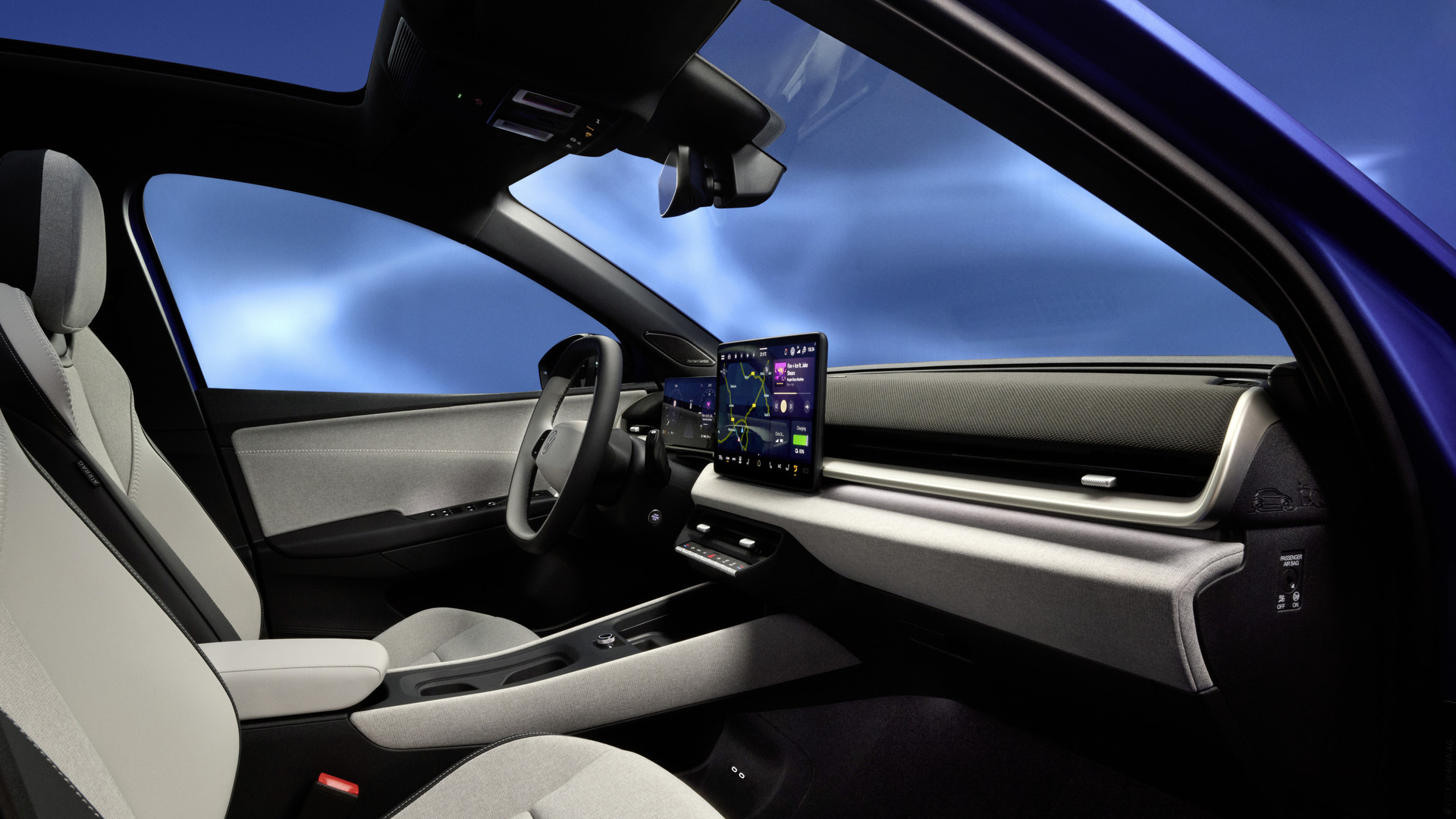 Derrière le volant se trouve un écran d’instrumentation numérique de 10,25 pouces, tandis qu’un écran tactile central de près de 13 pouces donne accès au système d’infodivertissement. Les deux écrans sont alignés horizontalement dans le champ de vision du conducteur, et l’interface comprend des graphismes mis à jour, des structures de menus simplifiées et une meilleure réactivité. Une nouvelle version du système ID.Light de Volkswagen s’étend du tableau de bord jusque dans les portes avant.
